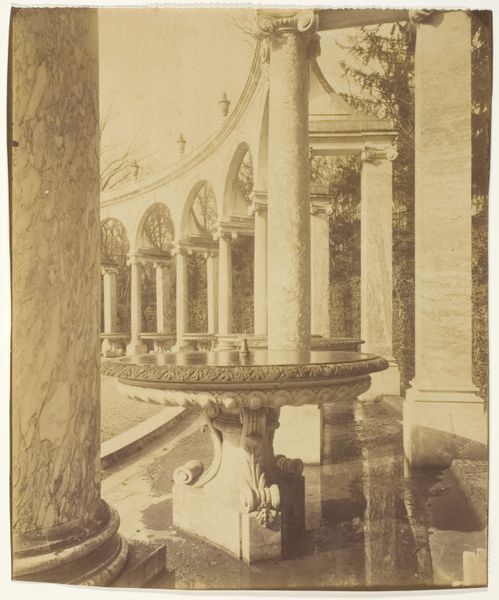 Curator: What immediately strikes me is the weight of history imbued within this sepia photograph of a column, situated inside the Saint-Julien-le-Pauvre church in Paris. It feels as if the image itself is a relic. Editor: Yes, there's a certain melancholy to it, almost a yearning. Looking at the physical print, though, I'm intrigued by the material itself. We're looking at a photograph, dating roughly from 1875 to 1900, documenting something decidedly site-specific. How interesting that photography was being utilized in the late 19th century to capture and, in some ways, disseminate architectural presence! Curator: Precisely. Saint-Julien-le-Pauvre has always been at the center of transitions and transformations; once a Roman road, then a Merovingian burial ground, a chapel, a priory… The column is therefore not just a structural support but a symbolic pillar holding up centuries of spiritual and societal shifts. Editor: And what of the labor involved in extracting and shaping the stone? Think of the quarries, the tools, the sheer manpower. These columns weren’t simply imagined; they were materially brought into existence through intense physical effort, reflecting specific economic and social dynamics. Curator: You’re right to point to the physical process of the column’s making, but its presence in a sacred space elevates it, transforming that manual labor into a testament of faith. It's a connection to something greater. The image itself carries a hallowed sentiment, with the columns alluding to principles and serving to elevate one’s perspective to what may come about. Editor: Yet, isn’t there a tension? Here’s a photograph, a readily reproducible image, documenting something unique and handmade. Photography, at that time, also brought about social revolution. The democratization of imaging contrasts so heavily with the exclusivity of what it depicts. A paradox, isn't it? Curator: That is the heart of cultural memory: images give us access to moments otherwise lost, they echo with symbolic resonance over time, and can elicit an awe for both the materials at hand, and what could be beyond what our eyes perceive. Editor: I agree; the photograph itself is an artifact documenting not just a physical structure, but also a moment in time when industrial production intersected with age-old architectural practices. I am grateful that we can analyze both today.
