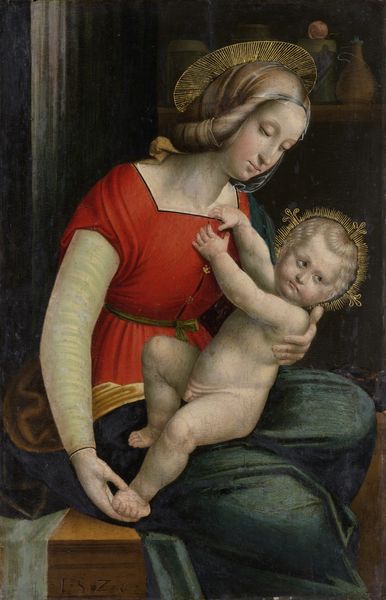 Jacopo Pontormo's "Madonna and Child" is an oil painting on panel, an established method in the early 16th century. Though seemingly conventional, the material reality of this painting reveals a great deal. Observe the bold, dynamic brushwork that defies the smooth, idealized style of the Renaissance. Pontormo's application of paint is almost sculptural, building up texture and depth, visible in the folds of the Madonna's dress and in the background. The artist challenges us by placing this tender scene against a backdrop of laborers. Pontormo has infused the work with social commentary on everyday life, a reminder that even the most sacred subjects exist within a world of human effort and toil. By attending to the materiality and social context of "Madonna and Child," we gain a fuller appreciation of Pontormo's artistic vision, seeing how he bridged the gap between the divine and the everyday, and how painting is always deeply connected to the world around it.