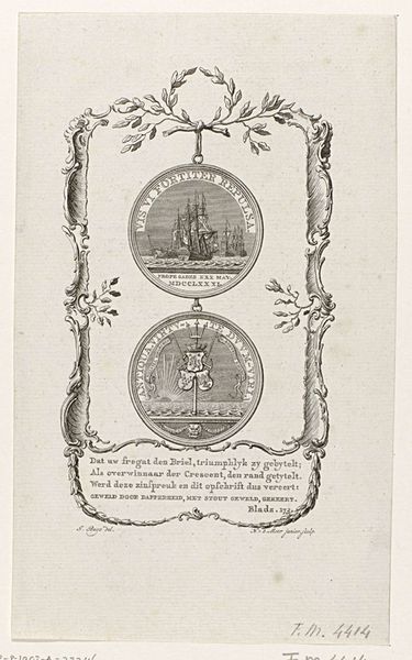 These commemorative medals honoring the naval battle of Cadiz and Willem Crul were created by Noach van der Meer II. In the late 18th century, the Dutch Republic was in decline, struggling to maintain its status in the face of growing British power. This print embodies the political and social tensions of the time. The medals celebrate naval victories and honor individuals, like Willem Crul, who were seen as symbols of Dutch strength and resilience. These medals, memorializing military and personal victories, reveal a society grappling with its identity and place in the world. The inscriptions beneath each medal serve as proclamations of pride and defiance, underscoring the emotional investment the Dutch had in maintaining their national pride. It speaks to a longing for past glories and the desire to reignite a sense of national identity in a changing world.