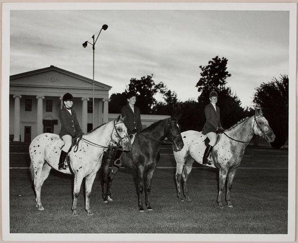 Editor: This silver gelatin print by Ken Whitmire Associates depicts a girl and her horse, proudly displaying their first-place award. The scene feels almost like a staged tableau. What can you tell me about it? Curator: Looking at this image through a materialist lens, I’m drawn to the labor involved in creating this image and participating in this activity, from the horse's training to the photographic process. The framing emphasizes the material conditions of leisure and labor. What do you think? Editor: That’s interesting. It highlights the social context and the economic background of the subjects in a way I hadn't considered. Curator: Exactly. It invites us to consider whose labor is made visible and whose is obscured. The photograph itself becomes a commodity, documenting and reinforcing a particular social narrative. Editor: Thanks, that really changes my perspective!