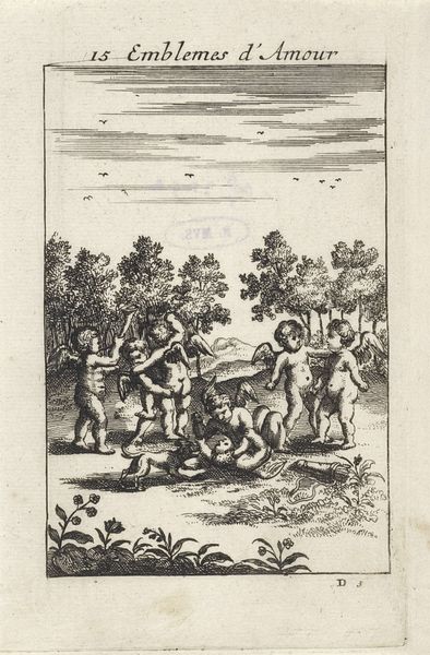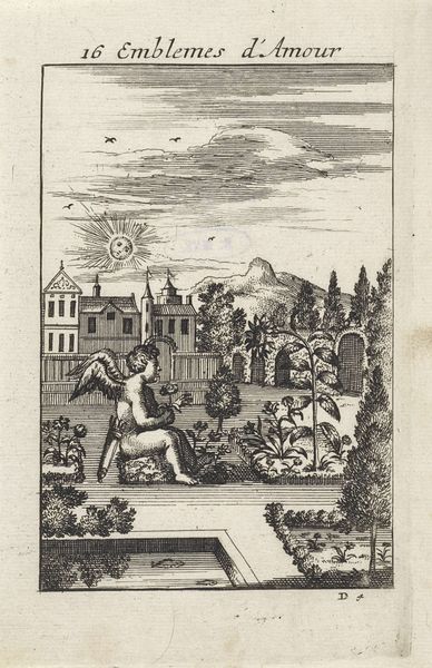 Curator: This is Jan van Vianen’s engraving, "Putti met vruchten bij een tuin," dating from 1686. Editor: My immediate impression is one of abundance, and yet it feels a little…contained. The putti and the fruit burst forth, but the formal garden and surrounding structure create a rigid boundary. Curator: That tension speaks volumes, doesn’t it? Consider the baroque period's fascination with allegory. Here, the garden, laden with fruit and mischievous putti, might represent earthly love, but it's love hemmed in by societal constraints and expectations. Editor: Absolutely. And we can see the materiality of it all— the engraving medium itself allows for incredibly fine detail in rendering those abundant fruits and the texture of the putti's skin. The production of the print, its accessibility, makes me wonder about the audience who would consume and interpret this imagery. Curator: Precisely. Who was it for, and what meanings would they have gleaned? The presence of enslaved persons reduced to cameos as decorations on the balustrade, framing this idyllic scene, prompts critical engagement with 17th-century Dutch societal values. How can we reconcile this seemingly innocent depiction with the socio-political structures of the time? Editor: The weaving together of paradise and oppression is sharp and subtle. It speaks volumes about what gets centralized and what remains purposefully unaddressed within a society, as mirrored through its artwork and the conditions of its artistic production. Curator: Looking through a contemporary lens allows us to ask the challenging questions that the image itself doesn’t explicitly pose, unearthing difficult but critical dialogues. Editor: Exactly. This engraving invites us to examine not just the "what" but also the "how" and "for whom"— unveiling hidden aspects of the socio-economic environment and manufacturing of taste and imagery during this time. It compels us to understand that representations, however beautiful, often participate in complex material and social arrangements. Curator: It truly demonstrates how a seemingly straightforward image can open into layered, profound reflections about both art history and our present moment. Editor: It underscores the continued relevance of understanding how power, production, and aesthetics intertwine to shape not just artworks but also the world we inhabit.