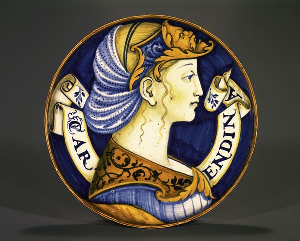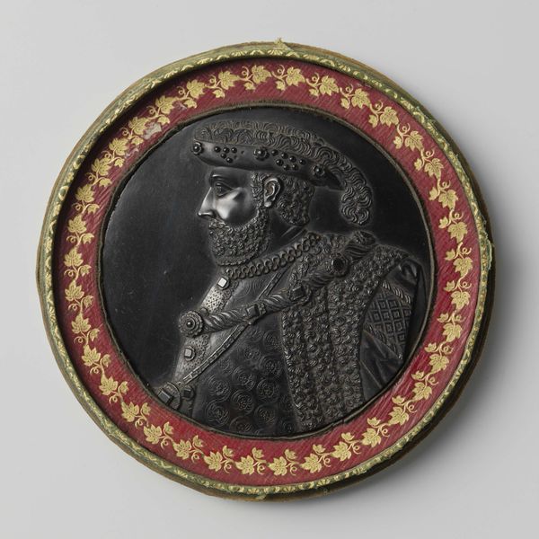Alfred André crafted this enamel pendant of Emperor Charles V, around 1880, now residing at the Metropolitan Museum of Art. The artwork's visual essence lies in its concentric composition and richly textured surface, creating a captivating interplay of light and shadow. The use of gold for the Emperor's figure contrasts with the dark enamel background, which imbues the piece with a sense of depth. André's manipulation of form is of interest here. The circular shape of the pendant, inscribed with 'CAROLVS V. IMP AVG CAES', is not merely decorative. It functions structurally, directing our gaze towards the Emperor's profile. The surrounding frame, embellished with intricate detailing and precious stones, further enhances the pendant's symbolic value as an object of status. This emphasis on ornamentation and precious materials echoes the complex semiotic systems of power. The Emperor’s image, rendered with meticulous detail, is not simply a portrait, but a carefully constructed representation of authority and historical legacy. The pendant's visual language invites us to consider how art serves to encode and communicate cultural values, offering a glimpse into the enduring interplay between aesthetics and meaning.