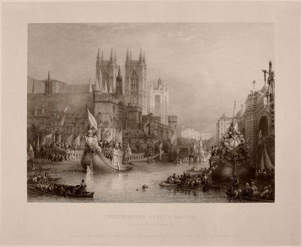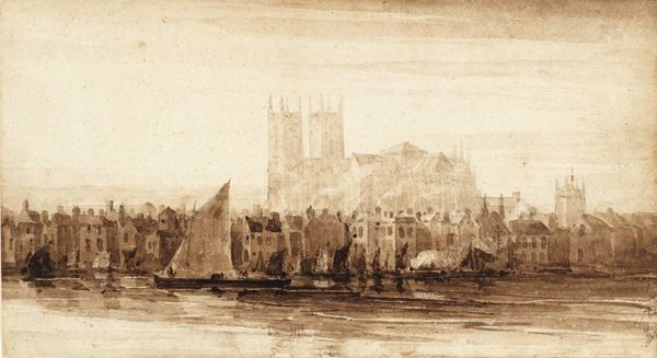 Editor: This is "Westminster from Lambeth," a watercolor created around 1813 by David Cox. It’s remarkably atmospheric. The way the buildings fade into the sky… It almost feels dreamlike. What strikes you most when you look at it? Curator: What I find compelling is how Cox presents a burgeoning industrial London. We see Westminster, a symbol of power and history, rendered almost ethereally, contrasted against the everyday lives playing out on the river. Consider the social dynamics; Who are these people swimming and working? Cox isn’t just showing us a pretty view. He is inviting us to consider London through different lenses, highlighting class divisions that become very visible. Don't you agree? Editor: Absolutely. The figures seem almost secondary to the imposing architecture, yet they give a sense of scale. So, it is not necessarily idealising the city, but also pointing to social stratification? Curator: Precisely. Cox isn't presenting a purely celebratory vision of urban life, which would be common. He is subtly weaving a narrative about labor, leisure, and the vast structures of power overlooking it all. Think about where this would have been displayed. Whose gaze was this painted for? The wealthy likely purchased images of working class endeavors while keeping their lifestyle exclusive and unattainable. Editor: That’s fascinating. I hadn't considered the social commentary. It makes the seemingly gentle wash of watercolors speak volumes. Curator: Exactly! The 'Romantic' era isn’t always just pretty landscapes. It can reflect anxieties and commentary on social and political transformations through carefully curated imagery for very specific audiences. Editor: Thank you, seeing it within that context has given me so much to think about! Curator: My pleasure! I now look at the painting from a refreshed viewpoint, as well.