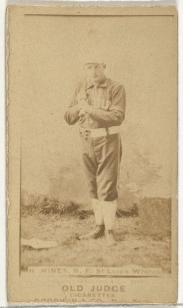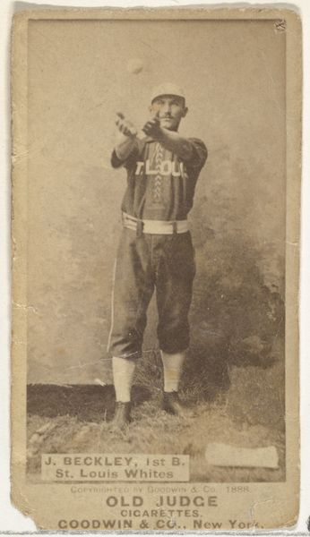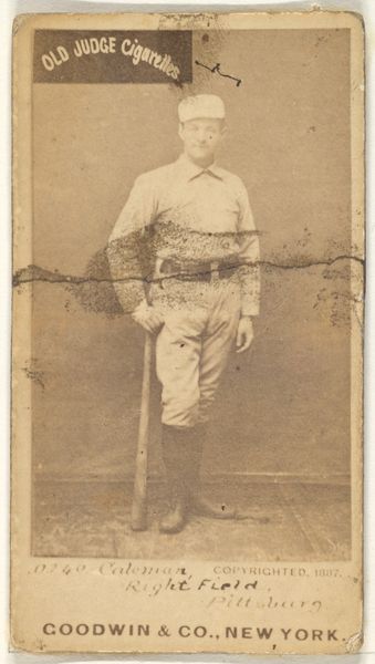 Curator: Looking at this photograph, it seems strangely both ghostly and poised. The tonal range is quite limited, rendering Ed Sproat, the St. Louis Whites pitcher, almost ethereal against the vaguely suggested background. Editor: Yes, its material existence is inextricably linked to its purpose as an advertising premium; specifically, baseball cards distributed in Old Judge Cigarettes, made by Goodwin & Company around 1888. Each card in the N172 series acted as a token, contributing to both commodity culture and baseball fandom in a burgeoning America. Curator: It is compelling to observe Sproat's stance, isn't it? There's an undeniable classicism here—the slightly contrapposto pose, the placement of the baseball bat across his shoulders, mimicking a classical staff. Editor: Exactly. It also brings into consideration questions surrounding labor and celebrity. The photograph collapses the player's identity with the Old Judge brand. Consider the exploitation inherent in producing this form of cheap commercial print at that time. Curator: I disagree with the label 'cheap print.' Look at the photographer’s effort to pose the subject and highlight his stance! Consider, the tones carefully create highlights around the edges, creating depth with an expressive quality through selective focus on the subject. Editor: Yet, we can't dismiss its broader impact. It created cultural accessibility to portraits in late nineteenth century America. The image became embedded within networks of consumption. Consider its broader impact on labor practices and advertisement strategies that still linger to this day! Curator: Yes, but that connection, and the focus of the portrait, really creates this fascinating tension. Editor: Agreed. The convergence of image and commerce undeniably shapes how we now receive the photograph's impact on us as viewers today.