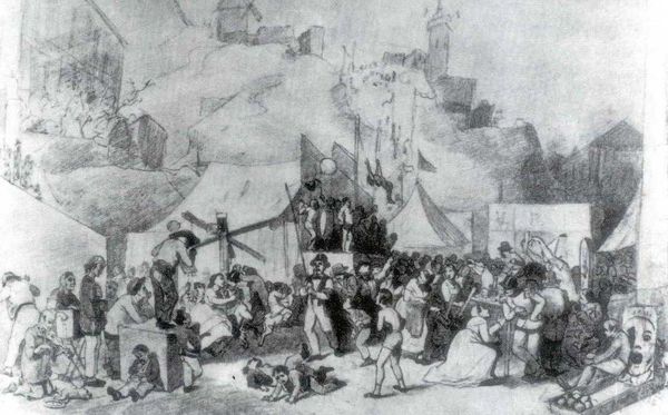 Vasily Perov's "Parisian Promenade," created with paper and watercolor, presents a scene of dynamic visual structure. It is dominated by earthy tones and loose brushstrokes, giving the impression of a quickly captured moment. The composition is divided into distinct spatial zones. The upper area features performance and musical boxes, while the foreground shows spectators. Perov uses line and form to create a sense of depth, pulling the viewer into the animated gathering. The structure of this piece raises questions about representation and spectatorship. Who is watching whom and how does this dynamic reflect cultural values? Perov challenges the viewer to consider the social dynamics at play and the meaning behind this Parisian promenade. Note the textural contrast between the rough canvas and the more refined faces of the figures. This contrast is not merely aesthetic; it emphasizes the tensions between spectacle and reality. The artwork, therefore, acts as a critical mirror, reflecting and questioning the values of its time.