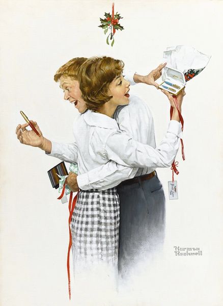 Curator: Norman Rockwell painted this scene, titled "She Gave Me a Parker 61," in 1959, capturing a sweet, familial moment. Oil on canvas, the artwork focuses on a father receiving a gift from his daughter. Editor: A rush of warm fuzzies! The composition is all soft edges and embraces. I can almost smell that slightly musty, comforting scent of old paper and leather. It is beautifully sentimental. Curator: Let's talk about the setting; though the backdrop is sparse, observe the material reality implied by the objects. We have the father's worn shoes, a somewhat crumpled birthday card and, of course, the brand-new Parker 61 pen set, all signifiers of class and commerce. Editor: True, but for me it sings of human connection, like the delicate gesture of the little girl hugging her dad. There's a tangible innocence, you know? Like when time stops. The world reduces to pure affection. A nostalgic fantasy, perhaps? Curator: Rockwell was a master of image production; creating idealized views of American life while meticulously staging photographs before setting to paint. This invites questions: Who benefited from such sentimental projections and what labour was involved in creating this apparently spontaneous moment? Editor: Yes, and look at how the faces are rendered; soft and flushed with feeling. They positively beam joy! He’s caught the brief sparkle in the gift-giver’s eye, a fleeting intimacy. Even if constructed, as you mention, the suggestion alone gives us, the viewer, joy too. Curator: Ultimately, "She Gave Me a Parker 61" reflects both the aspirations and the carefully constructed image of mid-century American life. The materials depicted speak volumes about the post-war economic boom, consumerism, and idealized familial roles. Editor: I leave this image filled with happiness and the impulse to share my fondness for the person standing next to me in the museum! It also reminds me of my dad; so, on a completely personal note, thank you Norman Rockwell!