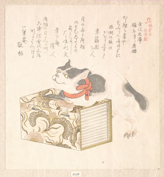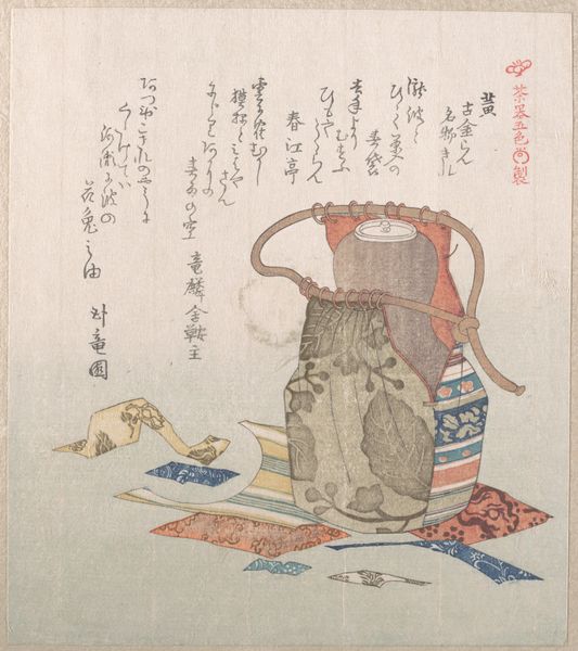 Curator: Let’s turn our attention to this vibrant woodblock print, “The Doll Festival, Third Day of the Third Month,” created in 19th-century Japan by Kubo Shunman. It's currently held in the collection of the Metropolitan Museum of Art. Editor: My immediate reaction is of a carefully arranged still life. The colors are muted yet rich, and there's a stillness that invites closer inspection. What particularly grabs me is the texture of those lacquered stands and how it contrasts with the doll’s smooth finish. Curator: Absolutely. This image gives us a peek into the 'Girl's Day' celebrations, a very specific cultural moment focused on well-being. These festivals and the imagery that accompanies them were carefully constructed displays of status and cultural identity. Editor: I’m especially curious about the materials employed, and the labor behind the printmaking. You can see the clear impression of the wood grain; the registration, whilst refined, isn't perfect - these small imperfections that signal human interaction. What can we discern about print production? Curator: The print, as a medium, became incredibly significant during this period in Japan. It facilitated wider dissemination of cultural norms and values among different social classes, not just the elite. The Doll Festival itself, while traditionally aristocratic, was being adopted by merchant classes. Editor: Exactly, the democratization of art production and ownership, particularly within urban centres, shifted cultural priorities. The Ukiyo-e tradition valued accessible artistic expression which in turn reflects material availability as much as cultural desires. Curator: Considering its display within the context of museums and galleries now, there’s a sense of transporting these ritual objects, and their history, into our own cultural understanding. How do we, as viewers in a different era, engage with such symbolism? Editor: The journey of this object from private ritual space to the public museum allows reflection on shifting tastes. While initially serving as culturally embedded tools, the material object becomes open to reassessment under present market values and ethical viewing contexts. It certainly asks questions about whose traditions are elevated in the West, and how these are materially made. Curator: I think it prompts consideration of how we assign value, culturally and materially, to objects from other eras, particularly in a museum context. Editor: I agree. It really shows us the multi-layered readings we can draw when art shifts in function over the centuries, especially when focusing on both process and sociopolitical context.