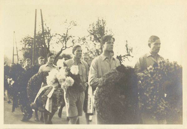 This photograph, Leerlingen van Schule Schloss Salem op weg naar het houtzagen, catches a moment in time, by an anonymous artist. The palette is limited to sepia tones, which suggests a focus on form and texture over vibrant color. It's all about the details. Look at the way the light catches the faces of the boys, casting shadows that hint at their thoughts, their seriousness. You can almost feel the weight of the wood on their shoulders, hear the crunch of gravel under their feet. The grain of the paper itself adds another layer to the image, making it feel like a tangible object, a memory. The composition pulls us along the path with the students, who seem to have somewhere important to be. Their shared sense of purpose reminds me of Bernd and Hilla Becher's photographs of industrial structures. They capture the stark realities of the post-war era. But, with their focus on shared human experience, this piece also relates to the work of the social documentary photographer August Sander.