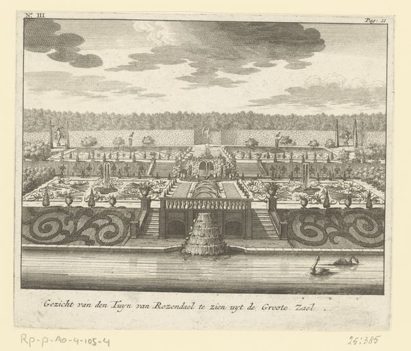 Editor: Here we have an engraving entitled "View of Sanssouci Palace and its gardens" created between 1747 and 1774, currently residing in the Rijksmuseum. It's fascinating how this very ordered landscape evokes a sense of control, but also a subtle feeling of artifice, like a stage set. How do you interpret this meticulously planned space? Curator: This image is an intriguing window into the Baroque era. What strikes me most is the relentless use of symmetry. Look at how the gardens mirror each other on either side of that central axis, leading straight to the palace. It speaks volumes about the desire for order and control that defined the era. Does that sense of control come across to you? Editor: Definitely, the strict symmetry is so imposing. But I’m curious about why someone would choose to represent space in this way. What were they trying to communicate? Curator: It's a constructed ideal. Royal power and the wealth necessary to manipulate nature on this scale. The geometric patterns are symbolic, each shape meticulously designed to reflect power and permanence. Beyond simple authority, I would venture to say it is a very material and visual attempt to reflect the Age of Enlightenment values like balance and reason, rendered into a tangible landscape. Editor: So it's like the garden itself is a symbol, beyond just being a pleasant place? Curator: Precisely. Consider the palace’s name, Sanssouci – "without worries." But is such a perfect space a place to truly escape anxiety, or simply an illusion thereof? Perhaps it serves more as an emblem of curated bliss than an embodiment of it. Editor: I never considered that tension, but now that you mention it, it makes this rigid symmetry much more thought-provoking! Curator: Yes. The cultural memory encoded within the garden design whispers of grand ambitions and controlled visions, reminding us that even "natural" spaces are often deeply shaped by human ideology. Editor: That’s really given me a new perspective. I had thought about the visual aspects but missed the layers of symbolic meaning, like this constant need to control the environment. Thanks for making me rethink that!
