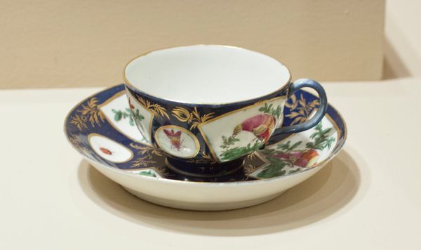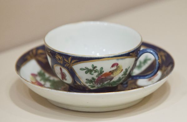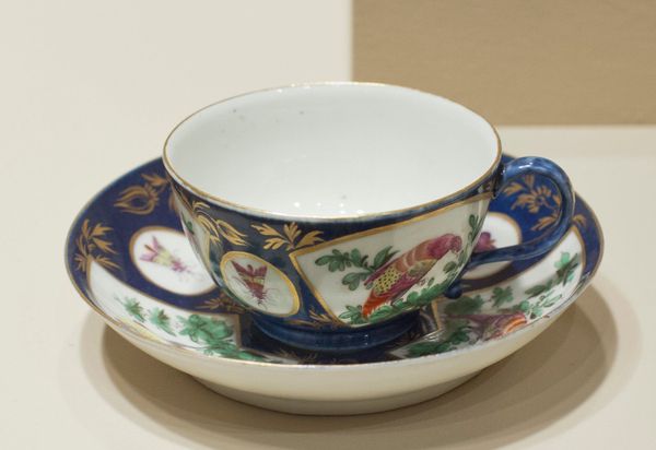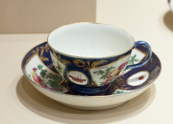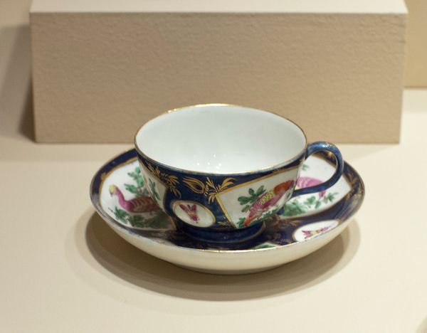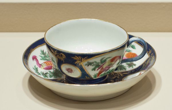 Curator: So elegant. The "Tea Cup and Saucer," made between 1765 and 1770 by the Worcester Porcelain Works, which later became Royal Worcester. It's currently residing here at the Minneapolis Institute of Art. Editor: Wow, talk about delicate. It gives off such a gentle, almost wistful air. Does anyone even *use* these, or are they just meant to be admired behind glass? Curator: Good question. These pieces were definitely meant for use, signifying status and taste during the Rococo period. Porcelain itself had huge cultural significance, traveling great distances and carrying powerful symbolic meaning associated with wealth and refinement. The decorative motifs played a role, too. Editor: Ah, the birds! I immediately clocked those—all nestled in these neat little bordered reserves with these fantastical plumes of color. It’s almost like a garden contained. Curator: Exactly! These weren’t just pretty pictures, though. The exotic birds often referenced a longing for the faraway, the "exotic other." Also, those tiny emblems with butterflies or perhaps moths held associations of metamorphosis and change. And, not to overlook, a nod to beauty of course. Editor: Transformation over tea? I’ll take it! What always gets me with pieces like this is that sense of…lost touch. We can appreciate the craft and skill but that whole language of status, these layered allusions. Is it irretrievably alien, you think? Curator: I see it more as a palimpsest, actually. The meanings evolve. The form is set, of course, but look at what we’re doing now – finding our own resonances within those forms, giving them new voice and vitality. Cultural memory adapts and lives on in new ways. Editor: Well, I feel like having a cuppa, and pondering life's many metamorphoses. I’m genuinely more appreciative now of that beautiful little "Tea Cup and Saucer" over there. Curator: Indeed! It shows that even small, everyday objects can hold complex histories and continue speaking across the ages.