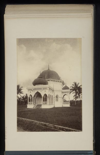 Curator: Let’s discuss this remarkable albumen print titled "Gezicht op de Leeuwenhof in het Alhambra te Granada, Spanje," dating back to 1906 by C Maufsaise. What are your first impressions? Editor: A strong sense of stillness. The monochrome palette and the rigid architecture create an imposing yet somber mood. The carved elements almost look like lace, yet the materiality seems quite solid and enduring. Curator: Absolutely. The photographic rendering invites an in-depth inspection of the structural repetitions and the interplay between light and shadow. Consider the pillars and their careful arrangement. How do they contribute to the image’s underlying geometry? Editor: For me, it is all about the meticulous detail. The labor that must have gone into carving these patterns is immense. I wonder, though, about the colonial context in which this photograph was created. How does Maufsaise engage with the site of the Alhambra as both a spectacle of Islamic artistry and a monument claimed by the Spanish Empire? Curator: That’s a critical point. The Alhambra’s artistic vocabulary—its arches, calligraphy, and intricate geometric designs—are undeniable features, composing a harmonious balance within the frame, regardless of the broader narrative. But let's think more abstractly. Semiotically, what does this controlled perspective convey about space, representation, and the photographer’s vision? Editor: I think the means of producing this image also matter significantly. Albumen prints required a lengthy and involved process. The artist's engagement is also one that implicates a larger network of labor and skill required to bring such beauty and precision into view. Curator: Your perspective enriches our understanding of the artistic practices prevalent at the time and reminds us of the many hands involved. Ultimately, "Gezicht op de Leeuwenhof" functions as more than just an architectural record; it's an aesthetic object inviting prolonged visual contemplation. Editor: Yes, and through our exchange, the dialogue between object and context allows for new ways of interpreting both artistry and craftsmanship in the photograph.