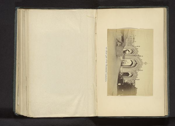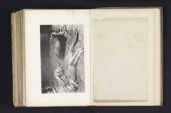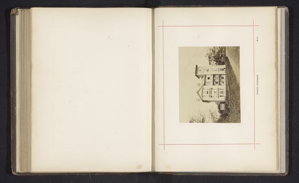 Curator: This is a photograph entitled "Gezicht op een monument voor Henry Wadsworth Longfellow in Portland," created before 1890. It seems to be part of a sketchbook, set opposite a blank page. What's your initial take on it? Editor: The first thing that strikes me is its melancholic aura. The contrast is quite high, with a sombre gray scale dominating the image. The aged paper and fading type definitely enhance this feeling. Curator: That’s interesting, given the subject. Longfellow was a cultural touchstone. So how was this monument itself presented publicly, what narratives was it perpetuating about literature and public life? Also, the open sketchbook asks interesting questions. Was it a form of homage, a contemplation of the artist's role in shaping public memory? Editor: Precisely! Consider how monuments, particularly to literary figures, function within the social fabric. They not only commemorate but also legitimize certain values. Who chose Longfellow, and what social standing or political agendas might they represent? This sketchbook photograph situates art as active cultural engagement. Curator: It highlights the dialogue between personal reflection and public performance. The choice of Longfellow – a writer whose work was deeply woven into the national identity – frames the artwork in terms of larger narratives. The composition, a statue framed by nature, creates a contrast between organic and the memorialized, but how does it further connect with the role of race and gender within those narratives? Editor: Indeed! It speaks to the exclusionary practices that shaped the monument and whose memory is preserved and validated by the political agenda. Perhaps we should consider what other artists or voices were systematically excluded at that historical moment in Portland? Whose stories are missing? This photographer could potentially address those complex, nuanced identities and make us examine historical bias within art history itself. Curator: That's the point! It pushes us to question the very foundation of cultural memory and who dictates its form. Editor: Exactly. A somber piece evoking the politics and privilege rooted within public monuments. The blank page calls to amplify other cultural and societal issues within our artistic lens. Curator: It forces us to contend with how images, both celebrated and obscure, shape our comprehension of the world and how it could, in fact, be shaped more ethically.