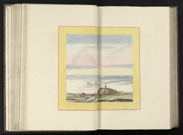 Curator: Let's turn our attention to this delicately rendered landscape: "View of Doullens" from 1656. Its artist remains anonymous, adding to its quiet mystique. Editor: There's a striking softness to it, almost dreamlike. The pastel hues of the sky contrasted against the green land…it feels surprisingly modern. But it has the scale of an intimate private view. Curator: Precisely. The watercolour technique lends itself to that atmospheric quality. What I find interesting is the perspective; it suggests a society keen to inventory, to possess its landscape through observation. The city is a clear focal point but the figures walking along the path in the lower right seem like tiny props in the larger narrative of the city. Editor: I agree. The labor of the scene is the act of recording it rather than the working life suggested in the distant buildings. It would be intriguing to understand how the artist prepared and combined the watercolors with a binding agent—the nuances would certainly impact the longevity and look of this art on display. But beyond that process, do you see a romanticising of nature here, perhaps deflecting the social tensions of the time? Curator: Possibly. Landscape art gained prominence alongside growing urban centers, becoming a site to project ideals, and to obscure or highlight socioeconomic realities. Watercolours would have been much more economical, and would circulate within a bourgeois culture developing a sophisticated understanding of its image, something previously only reserved for the upper echelons of society and government. The book form of this picture opens up other possibilities. This watercolour may have been one of a number that could easily circulate. Editor: Absolutely. And the book itself – the paper, the binding – those tell a story about materials and how readily information and art could be disseminated at the time. Were these available to a growing literate population? These are such fascinating windows into past worlds, don't you think? Curator: I couldn’t agree more; the role this image plays in larger networks is precisely where my interests lie. Editor: Likewise. Considering how the tangible and the recorded aspects blend together here…it's rewarding to consider all the angles this brings us to consider today.