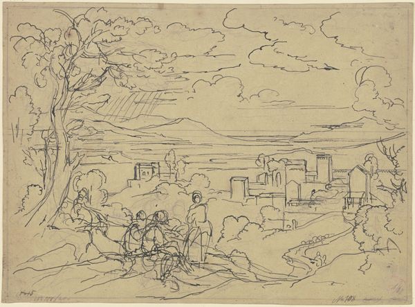 Curator: Here we have "A Village Scene in India [verso]," an ink drawing completed by George Chinnery between 1814 and 1824. Editor: It’s evocative. Something about the ruined architecture juxtaposed with the mundane tasks of the figures…a feeling of entropy, but a peaceful sort of decay. Curator: Let’s look closer at those materials. Note the artist’s confident strokes, the quick application of ink to capture the light and shadow across the textures of the crumbling buildings and the simple tools these people likely used. What strikes you about that? Editor: The ruined building reminds me of a stage set, deliberately evoking a feeling of faded grandeur. The arches, for instance—common symbols of passage and transition. Are they suggesting something about the colonial presence here, a gateway that’s already crumbling? Curator: Perhaps. Chinnery was, after all, working within the conventions of Orientalism, catering to a European fascination with the East. He's showing labor, animal husbandry and typical daily chores. Editor: Precisely! This work feels complicit in perpetuating a romanticized vision of India. The composition is careful. The posture of the woman, and the patient, bovine presence are tropes. Curator: I would say the subject matter might be considered through the lens of romanticism, if one considers the time of production and consumption as a potential commodity to appeal to certain British patrons. Editor: True, these structures speak volumes. How different building practices signal both dominance and perhaps the limits of control in a foreign landscape. Note the figure squatting—seemingly excluded from productive labor. Perhaps even expressing ideas about societal position within this constructed narrative? Curator: A compelling observation about the silent societal role represented by these artistic elements. In looking at Chinnery's work we can delve into the materials that helped make this visual history for future interpretation. Editor: And in doing so, perhaps even peel back the layers of iconography to see more clearly the complex social dynamics at play during that era.