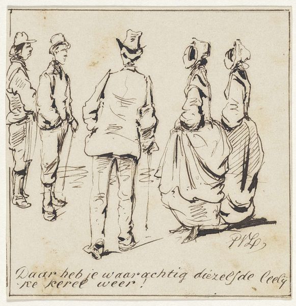 Curator: This drawing, "Knikkerende Jongens," possibly from 1648 by Harmen ter Borch, currently residing in the Rijksmuseum, presents a captivating snapshot of daily life. What strikes you most about it? Editor: It's the apparent casualness, that ‘snapshot’ feel that I find really appealing, the fact that Ter Borch may have quickly rendered this scene in pencil, in his personal sketchbook; also I'm intrigued to understand more about the production, or the act of making this type of drawing in the 17th century. What can we learn from a seemingly simple pencil drawing about society at the time? Curator: Good question! Consider the materiality. Pencil, though seemingly humble, speaks to accessibility and perhaps a quick, preliminary study. The drawing itself becomes a commodity, reflecting broader economic shifts. Look at the clothing depicted. What does their construction and, therefore, consumption, tell us? Editor: That's a great point. The clothes signify wealth – tailored jackets, hats. Would you say Ter Borch is challenging, or reinforcing, social hierarchies? Curator: The act of depicting everyday life, like children playing, elevates the mundane. Consider who the potential patrons were for drawings like these. Were they part of the elite, interested in glimpses into different social strata? It questions the boundary between 'high art' and the material realities of daily life. Editor: So the choice of subject matter, combined with the medium, redefines what's worthy of artistic attention? Curator: Precisely. The sketch exists because of the labor involved: from graphite mining to tailoring these young figures’ clothes. It also represents potential patronage and market demand. Harmen ter Borch makes visible and celebrates a segment of society. And, that has me questioning conventional distinctions within the art world itself. What’s your takeaway? Editor: I see now, it's not just a simple drawing of children playing, it shows access to production and wealth in artmaking.