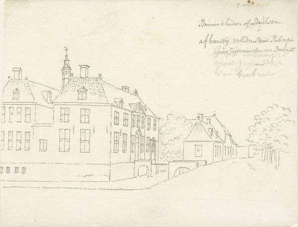 Curator: This is Cornelis Pronk's drawing, "Het stadhuis te Geertruidenberg," possibly from 1729, part of the Rijksmuseum collection. It’s a pencil drawing showcasing the city hall. Editor: Oh, my first thought is that it's incredibly precise, almost like an architect's blueprint. The faintness gives it a ghost-like quality. Did the artist intentionally use such delicate lines? Curator: The use of pencil allowed Pronk to capture details with great accuracy. This isn't just a portrait of a building, but a study of form. Consider the linear perspective; it emphasizes depth. Editor: There is also the facade itself: So formal and severe, each window identical to the next; but it is relieved by the slightly eccentric additions of the central tower and trees along the side. Curator: Precisely. That very tension between rigid structure and organic element. Notice also how he frames the central building with the diminishing structures on either side; a classical element to guide the eye. Editor: I do see that! This reminds me a bit of stage design, you know? Very planned, precise, yet somehow… incomplete without characters to fill the stage. All the geometry lacks human presence. It yearns for activity. Curator: An astute observation! Perhaps Pronk wished the building itself to become the protagonist. He reduces human presence in favour of civic architectural character as a symbol. Editor: Still, it sparks the imagination. I keep picturing 18th-century townspeople bustling about, all wigs and whispered rumors under the Dutch sky. That starkness almost makes me crave the narrative. Curator: Which speaks to its power: this objective rendering acts as a catalyst for subjective narratives to be spun about the location. It stands as both a testament to the structure itself and its potential to mean many things at once. Editor: Absolutely! So even in its stillness, it contains a thousand untold stories. Curator: Well said. An apparently simple rendering, but ripe for layers of deeper reading!
