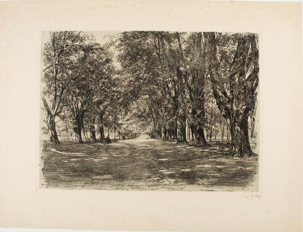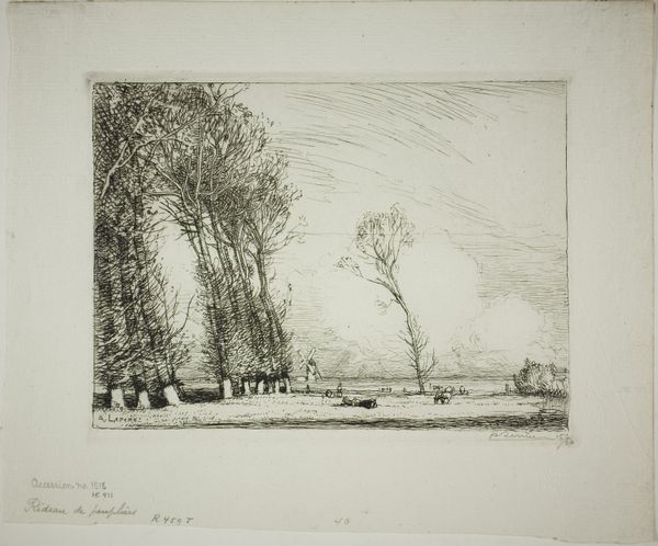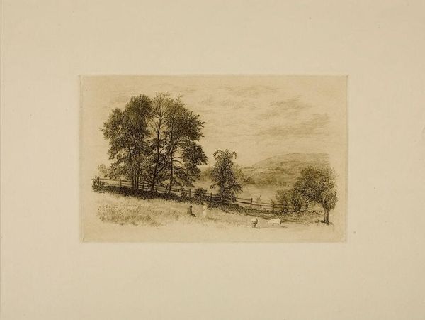Curator: Here we have Camille Corot's "Italian Landscape," an etching residing here at the Harvard Art Museums. What are your initial thoughts? Editor: It's a striking contrast between the foreground and background. The trees are densely packed, almost looming, while the distant sky is soft and open. Curator: Corot was deeply immersed in the Romantic movement; we should recall the public's growing appetite for idealized nature. This print catered to it, didn't it? Editor: Indeed. The composition invites the viewer into a harmonious space but notice how the etched lines articulate every leaf and branch, each contributing to the overall atmospheric effect. Curator: So, through careful technique, Corot shapes not just visual impressions but also the viewer's experience and emotions within this landscape. Editor: Precisely, it's this interplay between form and feeling that makes it so compelling. Curator: It certainly provides a glimpse into the artistic and cultural values of its time. Editor: And through its technique, offers a pathway into understanding form and structure.