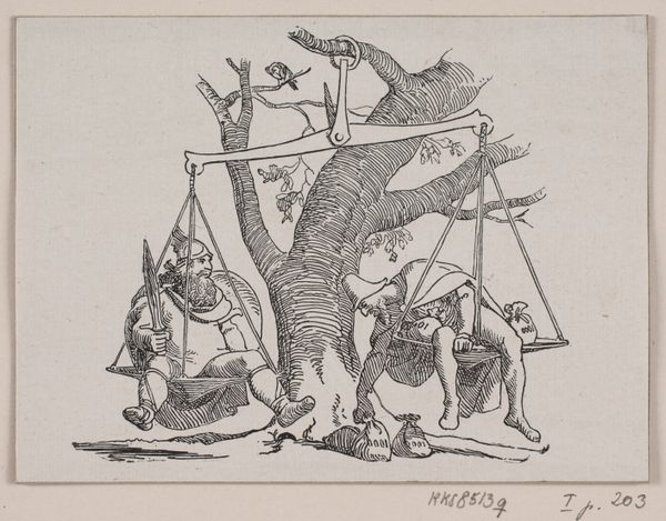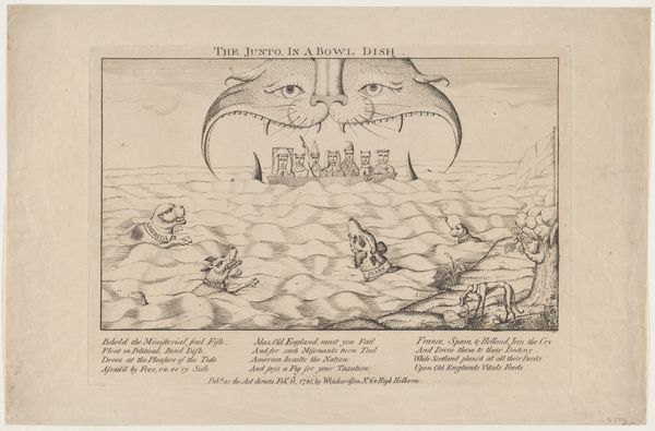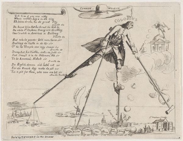 This satirical print, "Common-Wealth, The Colossus," presents a complex layering of visual and textual elements rendered in stark lines. The figure of the colossus looms large, elevated on stilts, visually dominating the scene with its exaggerated scale. Notice how the linear quality of the etching emphasizes the structural form, with each line meticulously defining shapes and spaces. The balance between text and image creates a semiotic dialogue where words and visuals act as signs, enriching the artwork's critical commentary. The choice of etching, with its sharp contrasts and detailed lines, enables the artist to deconstruct established meanings. In essence, the artwork destabilizes fixed notions by presenting them through a fractured, satirical lens, inviting viewers to question and reinterpret familiar power structures.