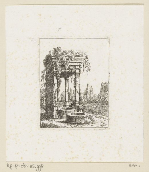 Hubert Robert created this print, "Plate 4: remains of a classical monument to right surmounted by a mask and tablet, a figure sitting on the porch, four figures on a staircase to left, four milestones below, from "Les soirées de Rome"", using etching. Robert lived during a time of aristocratic privilege, just before the French Revolution. Consider this piece as an allegory of power and memory. The ruins suggest a fallen empire, a critique perhaps of unchecked authority. The milestones and figures add a layer of human experience to this commentary. Those on the staircase seem engaged in a narrative we can only guess at. Is it rescue? Is it mourning? The mask above is silently presiding over the scene. Robert's vision blurs the lines between reality and an idealized past. It asks us to reflect on the transient nature of power, and how history shapes human interaction and identity. It evokes feelings of melancholy, inviting us to contemplate our place within the grand, ever-unfolding narrative of time.