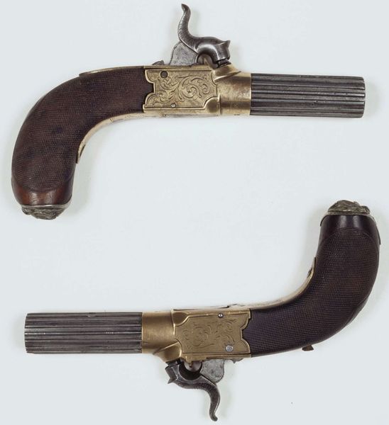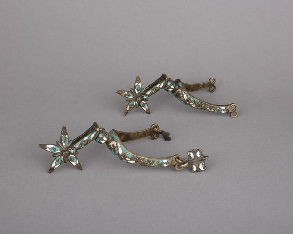 Curator: Here we have a pair of tube-lock hammers, crafted around 1819 or 1820 by Joseph Manton. They reside here at the Metropolitan Museum of Art. Editor: Oh, wow, these little metal sculptures feel so... deliberate. Like tiny heraldic beasts rendered in steel. Curator: Indeed. Notice how Manton marries functionality with embellishment. The curvature of the hammer body, along with the square opening at the base creates a delightful tension. The surfaces are adorned with precisely etched floral motifs, imbuing an otherwise utilitarian object with undeniable refinement. Editor: It's as if the blacksmith took a detour into a jeweler's workshop. The detailing on the scrolls… it’s delicate, almost fragile. They have this strangely appealing antiquated look, hinting at duels and smoke. I mean these things clearly played a role in stories we will never know. Curator: Their physical form echoes the era’s aesthetic preoccupations. We can even detect a certain vestige of medievalism that affected early 19th-century design trends. The weight and feel is no less crucial. Think of it, here is this object you can imagine in a pocket and these surfaces tell the whole story, from cold hard metallic composition to the very fine delicate detailing that sits next to a squared-off opening at the base. Editor: I guess what fascinates me most is the combination. The hammers are not merely objects, but little carriers of history, imbued with a weird grace despite being designed for probably a destructive purpose. Curator: Precisely! That intersection between beauty and utility is at the heart of so many compelling works. They capture the contradictory human drive to both create and obliterate. Editor: Thinking about those past times reminds you that we might have changed in surface appearance but have the same intrinsic concerns and drives as ever! Thanks, metal relics of dueling days. Curator: A somber, yet elegant meditation to be sure. Thank you.