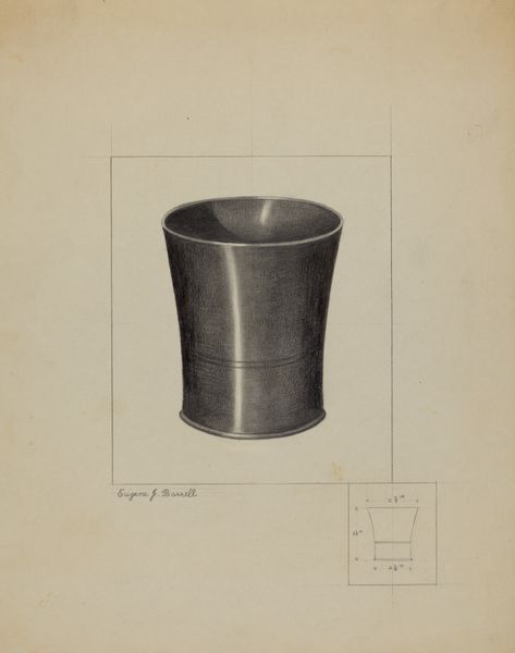 Editor: We’re looking at "Pewter Beaker," a pencil drawing from around 1936 by John Garay. It’s a pretty straightforward depiction, but the rendering of light on the pewter gives it an almost photographic quality. What can you tell me about it? Curator: This unassuming still life holds a powerful potential for dialogue. Let's think about "domestic arts," and the way gender is assigned to particular crafts. Pewter itself was historically associated with utilitarian objects. What does it mean, then, to elevate this mundane object through the painstaking work of drawing? Editor: It feels like it's about slowing down, maybe appreciating the everyday. Curator: Precisely. Think about the 1930s, the date of this work. We're in the midst of the Great Depression. There's a political dimension here too. Realism, like we see here, becomes a valued aesthetic, a commitment to representing the lives and objects of ordinary people at a time of great precarity. Editor: So it’s not *just* a simple beaker, but almost a symbol? Curator: Symbols emerge from social conditions, not from a vacuum. What might the choice of rendering a common drinking vessel say about class and value in that historical moment? Think too, about access to resources. Pencil and paper are inexpensive; luxury materials, not so much. Editor: I see what you mean. Looking closer, the tiny, precise rendering of a measuring device reinforces that idea of working-class utility, not just art for art’s sake. Curator: Exactly. This drawing allows us to see connections between art history and social history, asking who is represented, how, and why. Editor: It's made me reconsider how I perceive value, both in art and in everyday objects. Curator: And how the artist can imbue those everyday objects with new meanings, revealing deeper social narratives.