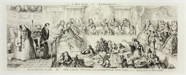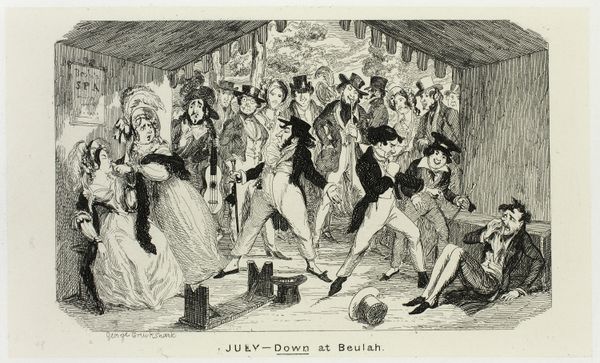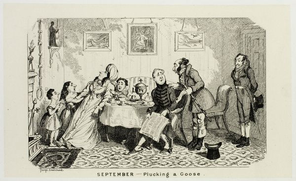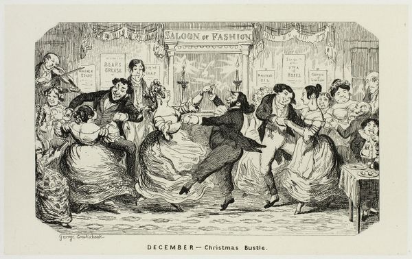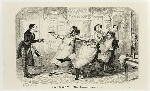 George Cruikshank made this steel etching titled ‘February - First Rout’ as part of the Comic Almanacks, a series that spanned from 1835 to 1853. It’s a satirical take on the social gatherings, or "routs," of the British upper class. Cruikshank, working in 19th-century Britain, uses caricature to critique the manners and appearances of the wealthy. Note the exaggerated features and the chaotic scene, reflecting a commentary on the perceived excesses and superficiality of high society. These Almanacks were widely popular, suggesting a broad public interest in critiques of the elite. The artist's work invites us to consider the role of satire in shaping public opinion. To delve deeper, explore the social history of Victorian England, looking at sources like periodicals, etiquette guides, and fashion plates. These can illuminate the context in which Cruikshank’s art was both created and understood. Art, after all, is inseparable from the social and institutional forces that give it meaning.