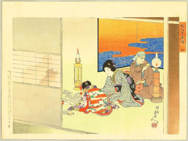 Editor: This is "Bathing in the Sea" (Kaisuiyoku), a color woodblock print made in 1898 by Gyosei Shuntei. I'm struck by how contemporary it feels despite being over a century old, almost like a snapshot. What historical context am I missing here? Curator: Absolutely. Its "snapshot" quality relates directly to Meiji-era Japan and its rapid westernization. This print reflects changing social mores, especially concerning women and public space. Notice the women wading in the water, some in minimal clothing for the period – a stark contrast to earlier, more restrictive depictions of women. Editor: So, the act of women bathing in the sea itself carries significance? Curator: Precisely. This image challenges traditional norms by showing women enjoying leisure activities publicly. Consider also how the landscape elements aren’t simply background but are integral to understanding the social shift. The coastline is no longer just a place of labor but one of recreation. Do you see any tension between traditional Japanese artistic styles and Western influences? Editor: I do now. The print technique is distinctly ukiyo-e, but the subject matter seems so... modern. The composition is divided into distinct areas by the pillar and rising ground, and each area contains people engaging in distinct but social activity. The sunset is the traditional ukiyo-e feature that signals we're in Japan, as do the kimono. Curator: That tension speaks volumes about Meiji-era anxieties and aspirations. It encapsulates a moment where Japan was actively negotiating its identity between tradition and modernity, East and West, restriction and opening, even in leisure activities. The beach becomes a stage for renegotiating these social and cultural scripts. Editor: I hadn't considered it that way at all. Thank you. I will certainly look differently at other artwork from this era. Curator: This one image encapsulates many aspects of Meiji-era change: you can use this artwork as a gateway to further exploration!