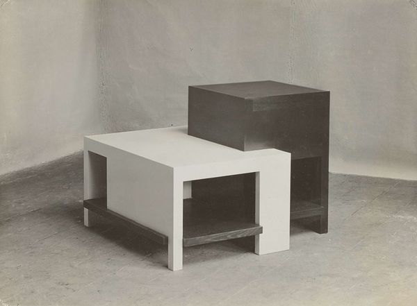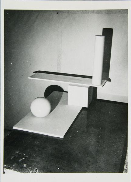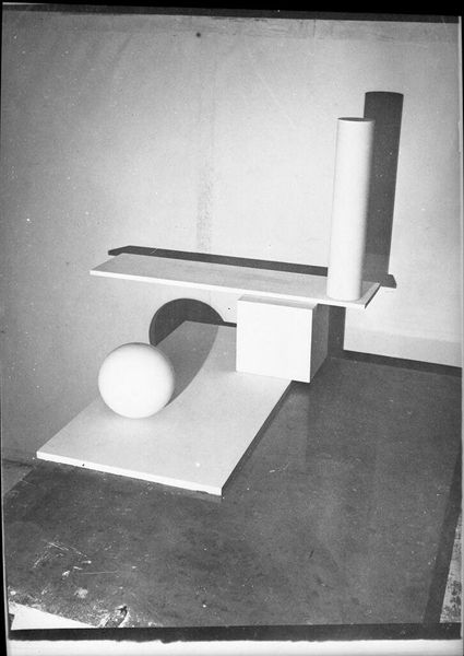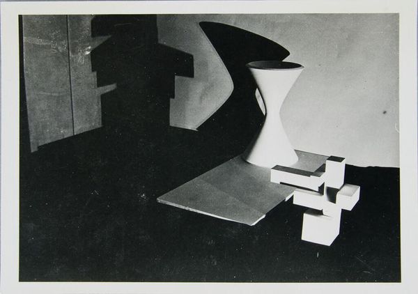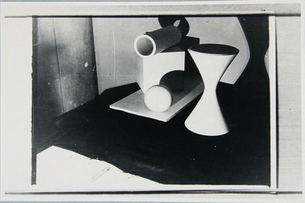 Editor: This photograph, "Work from Joost Schmidt's Sculpture Workshop" by T. Lux Feininger, features an arrangement of geometric forms. The stark contrasts create a very dramatic effect. What strikes you about its composition? Curator: The interplay of light and shadow immediately captures my attention. Notice how the artist uses these elements to articulate volume and define space. The strategic arrangement of forms creates a dynamic visual rhythm. Editor: It almost feels like a miniature cityscape. The shapes are so clean and precise. Curator: Indeed. The focus on pure form and geometric abstraction aligns with the Bauhaus aesthetic, wouldn't you agree? The artist emphasizes the intrinsic qualities of the shapes themselves. Editor: Absolutely. It’s interesting to see how a simple arrangement can evoke such a strong sense of structure and design. Curator: Precisely; and the absence of color directs our attention to the compositional elements. This exercise hones one's ability to dissect the visual language of art.