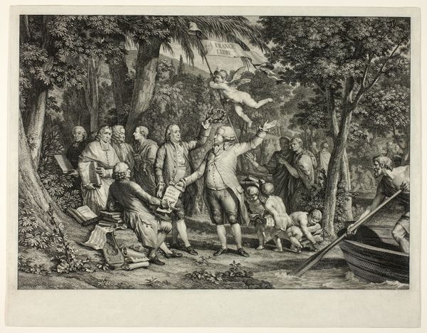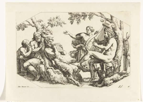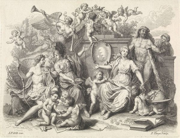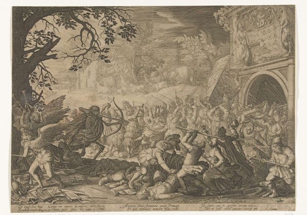Frans van den Wyngaerde created this print, titled "Soldiers and peasants, sitting and fighting near a table," in the mid-17th century. It depicts a chaotic scene of conflict between soldiers and peasants, likely in the context of the Eighty Years' War between the Dutch Republic and Spain. The image creates meaning through its dramatic composition and detailed depiction of the figures' expressions and gestures. The clash between the armed soldiers and the vulnerable peasants highlights the social tensions and power dynamics of the time. Made in the Netherlands, this print reflects the economic structures of the Dutch Golden Age, a time of both prosperity and conflict. This work critiques the social structures of its time, portraying the violence and disruption caused by war. To understand this artwork better, we can consult historical records, political pamphlets, and visual culture of the 17th-century Netherlands. Art's meaning is always contingent on its social and institutional context.