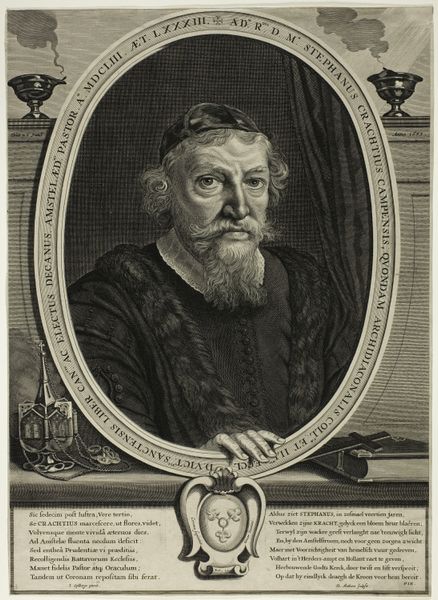 This is Theodor Matham’s portrait of Stephan Crachtius, made with engraving. As a print, it is inherently of its time, when the proliferation of imagery was becoming newly possible. Engraving is a particularly interesting medium. Here, a metal plate has been worked directly with a tool called a burin, carving away tiny slivers of the material to create a dense mesh of lines. The plate would then be inked, the surface wiped clean, and the ink captured in the carved lines transferred to the paper under great pressure. Consider the labor involved in producing this likeness, the intense concentration and skill required. Notice how the artist used the build-up of lines to describe the fur collar, the stubble on Crachtius’ face, and the folds of his cap. Every detail, even the wisp of smoke from the candle, has been carefully rendered. In the end, it is the materiality and the making, which gives this portrait its unique power, forever capturing the likeness and the moment in time.