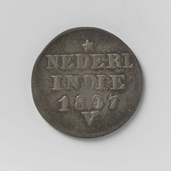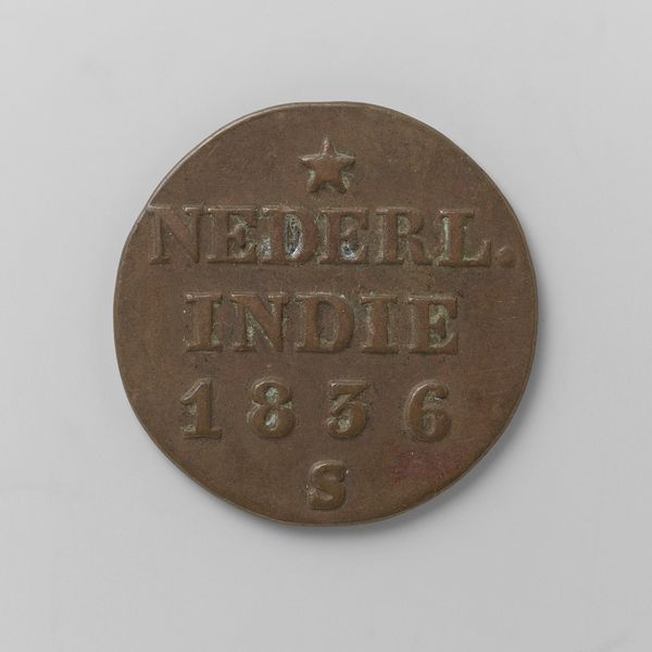 Curator: Let's turn our attention to this small yet weighty artifact, a ½ Duit coin for Nederlands-Indië, or the Dutch East Indies, originating from Amsterdam in 1815. Cast in bronze, it offers a tangible link to a complex chapter in Dutch colonial history. Editor: Immediately, I’m struck by its…ordinariness. It’s a coin, humble in size, yet the embossed text— "Nederl. Indie"— screams of empire and exploitation. The stark contrast between form and context is unsettling. Curator: Precisely! Coins like these were crucial tools in establishing Dutch economic dominance. This wasn't just about trade; it was about controlling labor and resources in the Indies. Willem I’s image, though not present here, was typically stamped on these, solidifying his rule. Editor: It’s disturbing to think of this coin, probably passed between Javanese or Sumatran hands, each transaction reinforcing a system of oppression. The single star at the top—does it symbolize the Dutch aspirations, a guiding light of colonialism? Curator: It could be interpreted that way. Numismatists often debate the symbolism on these coins, but what's clear is the strategic placement of "Nederl. Indie" – Dutch East Indies – asserting ownership. This half-duit, seemingly insignificant, served as a constant visual and tactile reminder of colonial power. Editor: So, even something as ubiquitous as currency became a tool for reinforcing imperial ideology. It forces us to consider the subtle ways power operates, embedding itself within everyday objects. It’s not just about grand historical narratives, but the small-scale exchanges, the faces of a subjugated people, forced to operate under the terms dictated by these colonial instruments. Curator: I agree. This little coin embodies so much of that historical tension, the micro-politics of empire. I find it incredibly powerful. Editor: Yes, it reframes the whole perspective of history; each ordinary thing we find in our pasts tells a different story if we can only understand its meaning and its impact.