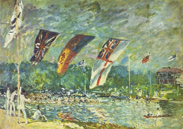 Editor: So, here we have Childe Hassam’s "Avenue of the Allies," painted in 1918 using oil on canvas. It feels very celebratory and…patriotic, I suppose, with all those flags. What do you see in this piece? Curator: Indeed! The flags aren’t merely decorative; they're potent symbols of the Allied nations during World War I. Consider what those colours, those patterns meant at the time: unity against a common enemy, a visual rallying cry. The flags, primarily the British and American flags, represent political, cultural, and military ideologies. Why do you think Hassam chose to feature the flags so prominently? Editor: Perhaps to show America's support and alliance with other nations during the war? It's interesting how he's almost abstracted them, though, into fields of colour. Curator: Exactly! He uses Impressionistic brushstrokes, softening the edges, suggesting movement and light. What do these blurred lines and movement convey to you, beyond mere representation? Editor: Hmm… maybe the constant change and turbulence of wartime, but also, like… hope? That even amidst chaos, there's a vibrant future? Curator: A beautiful interpretation! Each flag becomes an emblem loaded with social and emotional meaning and cultural aspiration. By massing these banners, Hassam's not only commemorating an alliance but also, perhaps unconsciously, hinting at the complicated intersection of patriotism and national identity, and collective hope in trying times. It's like he’s painted a memory, a collective aspiration. Editor: It definitely gives me a lot to think about—it's more than just a street scene; it's a captured moment of collective sentiment and visual memory. Curator: Precisely. And that, my friend, is the power of symbolism in art.