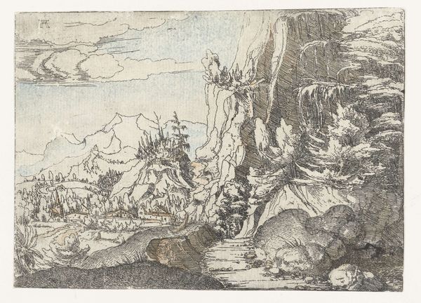 Curator: Standing before us is "Landscape with High Rocks and Fortresses" by Augustin Hirschvogel, created in 1546. This captivating drawing employs ink on paper to depict a sprawling landscape dominated by imposing rock formations and fortified structures. Editor: My first thought? Isolation. The fortress perched atop those craggy rocks… it's so detached, almost menacing despite the tranquil landscape surrounding it. The ink gives it this brittle quality too, like the whole thing could crumble. Curator: It's interesting you perceive menace. I see Hirschvogel engaging with the evolving political landscape of the 16th century. These fortresses symbolize power, but also vulnerability in an era of constant territorial disputes and religious conflict. His rendering speaks to a precarious balance. Editor: I agree the context is vital, and those rocky crags, the way he’s etched them—they are raw and imposing, like a monumental barrier constructed over long ages. Thinking about the ink itself, the labour invested, how those lines create a believable landscape... that draws me in. How was something so huge reduced into this portable picture? Curator: Hirschvogel skillfully uses line work to create depth and texture, echoing the contemporary philosophical obsession with observation and experience. This work anticipates scientific visualizations while speaking to deeply ingrained anxieties around territorial control. It's intersectional as a product of religion, philosophy, art, and conflict. Editor: Exactly. This level of detailed observation surely required dedicated training and craft. And consider the material constraints— the specific qualities of that paper, the preparation of the ink. It underscores the socio-economic structures needed to sustain artistic production, no? Someone was making these materials available, and determining their price point, allowing its creation. Curator: Yes. We can explore these conditions too. The level of refinement in Hirschvogel's technique elevates printmaking to an intellectual project. This transforms our understanding of what is considered "high art." He questions fixed canons of artistic expression. Editor: For me, contemplating this Landscape prompts a vital re-assessment of material origins and economic access when studying early landscape prints. Curator: Absolutely, our readings inform each other. Analyzing it using combined lenses opens dialogues about production, access, conflict, and control, broadening the history to the complex interplay in Northern Renaissance identity.