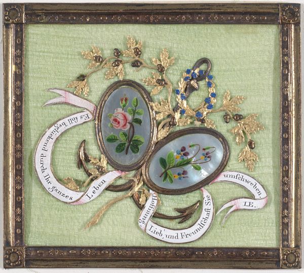 This early 19th-century greeting card by Johannes Endletzberger presents us with an intimate tableau rendered with delicate precision. A muted palette of blues, greens, and pinks lends an air of understated elegance to the small sheet. Notice how the composition orchestrates a play between nature and artifice. The column, urn, and stylized foliage create a symbolic landscape of memory and sentiment. The inscription, carefully handwritten, becomes a central element, a textual monument to friendship, literally scripting emotional display. This carefully constructed composition is both a personal message and a reflection of broader cultural codes. The arrangement invites us to consider how such tokens functioned within social exchanges, embodying values of friendship, remembrance, and cultivated taste. It is a material expression of affect, shaped by both artistic convention and deeply personal sentiment.