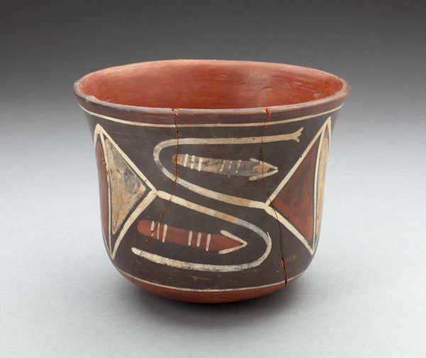 This cup was made by the Nazca people, using ceramic. Its form is simple, but the painted decoration is anything but. Note how the geometric motifs are carefully applied, giving the cup a strong visual rhythm. It is likely that the maker was a specialist. They would have had to source the clay, shape it by hand or with simple tools, and then fire it. The paints, too, would have been carefully mixed from mineral pigments. The patterns could be abstract decoration, or perhaps hold a deeper symbolic significance. What is clear, though, is that this was an object of value. Its decoration speaks to a desire for beauty and meaning in everyday life. This cup reminds us that even the most humble materials can be transformed into something special, through skill and imagination. It challenges our assumptions about the divide between art and craft.
