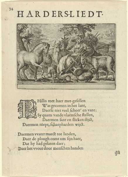 Editor: This is "Man en vrouw te paard," or "Man and Woman on Horseback," a print, likely an engraving, made between 1624 and 1645 by Jan Gerritsz Swelinck. It's a charming, almost comical image, with a couple crammed onto one horse against a vast landscape. The figures are so round! How should we understand a piece like this? Curator: That charming quality is deceptive, I think. This print isn't just a whimsical scene; it's deeply embedded in the social and political climate of the Dutch Golden Age. Consider the context: Prints were a primary medium for disseminating information and shaping public opinion. The poem below suggests that country life may not be as liberating as it looks, as land can still not be touched, so there still exist many issues despite gaining land, which may reflect sentiments toward landowners who became important following The Eighty Years' War (1568-1648). Does that add another layer of nuance? Editor: It does. I was focusing on the seeming lightness of the image itself, but the historical element of social classes is interesting. So you're saying it's not just about the individual figures, but what they represent in society? Curator: Precisely! Look closely at the clothing; consider the way the landscape itself is rendered. How are these conventional in artwork during the period? These details point towards particular social groups and their relationship to the land and to social status, both important societal themes at the time. Understanding how imagery like this circulated helps us understand the formation of public identity and the subtle power dynamics at play. Editor: It’s amazing how much social context can be packed into such a small print. It’s a far cry from a simple genre scene. Thanks! Curator: Absolutely. It reveals how art shapes, and is shaped by, cultural narratives. Thank you, I feel like I have learnt even more as well!