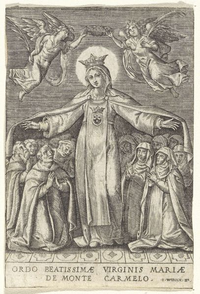 Editor: This is "The Madonna of Mercy," a print made around 1517 by Hans Schäufelein. The figures have an elegant quality, and I notice how everyone below looks up at Mary and the Christ Child with such hopeful, expectant faces. What strikes you when you look at this piece? Curator: I am immediately drawn to the protective mantle of the Madonna. It’s not just fabric; it’s a symbolic shelter, shielding those who seek refuge. Note the contrast between the crowned Madonna and the supplicants below. What emotional impact does this layering create for you? Editor: It highlights the Virgin’s role as both divine and merciful. It also suggests a social hierarchy, with her positioned far above everyone else. Are there precedents for representing Mary like this? Curator: Indeed. This iconography reaches back to ancient Roman images of emperors offering protection to their subjects, updated and adapted for a Christian context. This continuity speaks volumes about how societies co-opt powerful imagery. What does this transference suggest to you about the symbolic potency of images through time? Editor: I see what you mean, there’s something universally compelling about that imagery of protection and power. I hadn't thought of how this Madonna image reuses existing symbols of authority. Curator: Exactly! Understanding those roots illuminates how the image functioned, reinforcing specific cultural and spiritual values for its audience. Editor: Thank you, I now understand how symbols evolve. Curator: Likewise, tracing this symbolic evolution, that’s a direction for new questions.