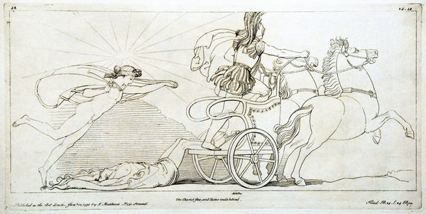 Curator: The engraving you’re now viewing is entitled "Genius of Mars". The print is by Giovanni Battista Piranesi. Editor: It strikes me immediately as very linear. A sharp, stark sort of presentation; neoclassical, of course, in its precision, but with something playful. It feels almost…unfinished. Curator: Perhaps that airiness is deliberate. As an allegorical representation of Mars' spirit, rather than the god himself, the scene lacks some of the weight one might expect. Mars' association with both war and agriculture in Roman culture indicates prosperity—abundance that springs seemingly from nowhere. It reminds me of how Renaissance and Baroque thinkers associated the planet Mars with energy, creativity, and strong emotions. Editor: I notice how much the horses dominate. They seem full of vigor and power, their lines straining as though poised at the precipice of action. A curious choice given we're talking about the spirit of Mars, usually connoting military prowess. The focus is primarily on harnessing raw force—the untamed steeds over the chariot, its simple wheeled carriage. Curator: Exactly! And note the Cupid driving that carriage— Eros-like. A symbol here, I believe, of a much deeper narrative within Roman mythological themes. This isn't about violent conflict, but about controlled release. The energy is bound by Cupid; thus, by Love, as opposed to the outright destruction associated with Ares. The cultural memory linked with the imagery is one of order and control of primal instincts, rather than celebrating martial power alone. Editor: An interesting point. To me, those thin, controlled lines reinforce restraint visually, giving the subject an austere edge over a dramatic flourish. The composition certainly favors clarity—each element distinct and legible. Its formality emphasizes intellectual command, a design far from chaos or visceral impact. Curator: Well, Piranesi was deeply influenced by history, not only aesthetically but ideologically. He explored not just the power of Rome, but also what underlay and continues to underlie that idea. He’s asking how power and passion find balance and express themselves through culture over time. Editor: Indeed. Through an examination of Piranesi's construction, as well as considering Cupid and horses as metaphors, my perception of this work has subtly shifted to an understanding of restrained potential. Thank you.