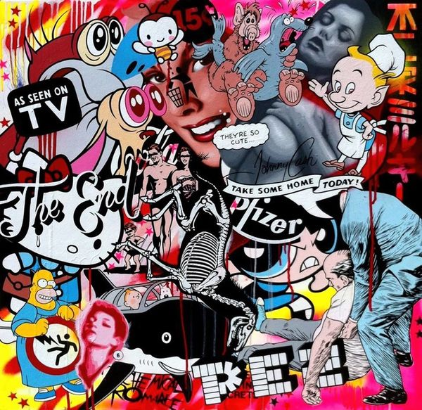 Ben Frost created this mixed media on canvas piece, "Dawn of the Dead," sometime after 1975. Frost, an Australian artist, is known for subverting familiar imagery from pop culture and advertising. In this work, we see an overwhelming accumulation of cultural references: cartoon characters, fast food icons, horror movie figures, and advertising slogans, all mashed together in a chaotic composition. The artist appropriates and distorts these images, transforming them into something unsettling. This challenges the viewer to confront the dark underbelly of consumer culture and the media saturation of modern life. Frost's piece can be seen as a critique of the institutions that perpetuate these images. His art forces us to question the social conditions that allow these images to dominate our cultural landscape. To better understand the cultural references in this artwork, we can research the history of advertising, the evolution of cartoon characters, and the rise of fast-food chains.