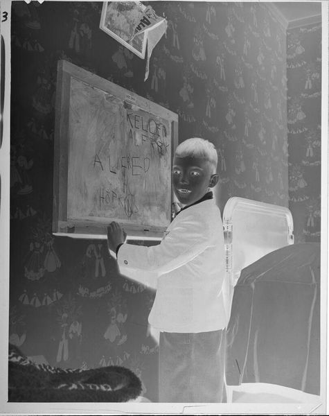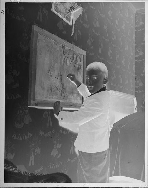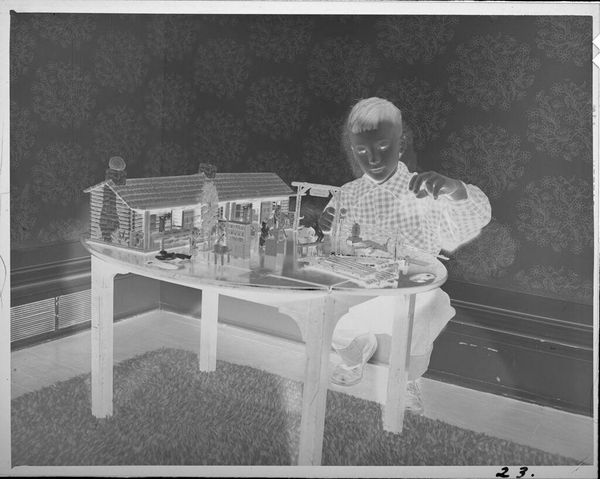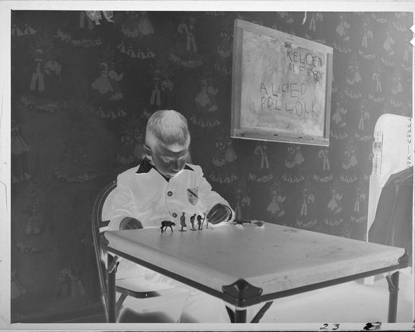 Editor: This photo, simply titled "Untitled (boy at table playing with toy figures, eyes closed)" by Lucian and Mary Brown, shows a child seemingly lost in his own world. What's your take on this intimate scene? Curator: I see a fascinating interplay between private imagination and the social construction of childhood. Notice the wallpaper and the chalkboard—they hint at imposed narratives, perhaps educational or societal expectations. Editor: So, is the boy's closed-eyed play a form of escape, a rejection of those external narratives? Curator: It could be. Or, it may be a negotiation. The toys themselves are cultural artifacts, shaping his understanding of the world. How does the act of play become a rehearsal for adulthood, influenced by the available "props," so to speak? Editor: That makes me rethink the simplicity I initially saw. Thanks! Curator: Indeed! Considering the socio-political context transforms a simple photograph into a complex statement.