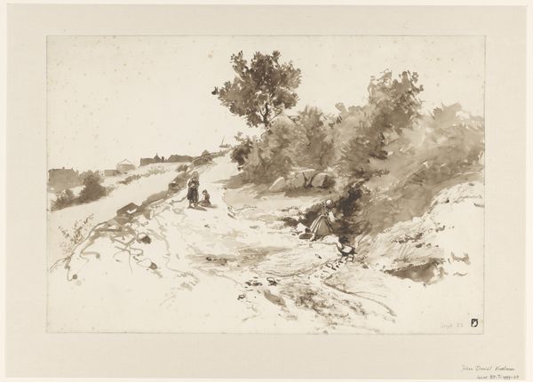 Guillaume Anne van der Brugghen created this landscape drawing with pencil and brush, using brown and grey ink. These are relatively humble materials, portable and easily deployed in the open air. The artist's technique here is particularly interesting, focusing on quick notations, an approach which emphasizes the direct, physical act of drawing. This is evident in the wet strokes and the soft shading used to capture the subtle shifts in atmosphere and light. The landscape is rendered with a sense of immediacy. Consider the social context, where artists sought to capture the essence of nature, reflecting a growing appreciation for the rural landscape. Through the choice of simple materials and direct techniques, van der Brugghen invites us to consider the relationship between the artist, the environment, and the act of creation. The drawing collapses any assumed distinction between observation and interpretation.