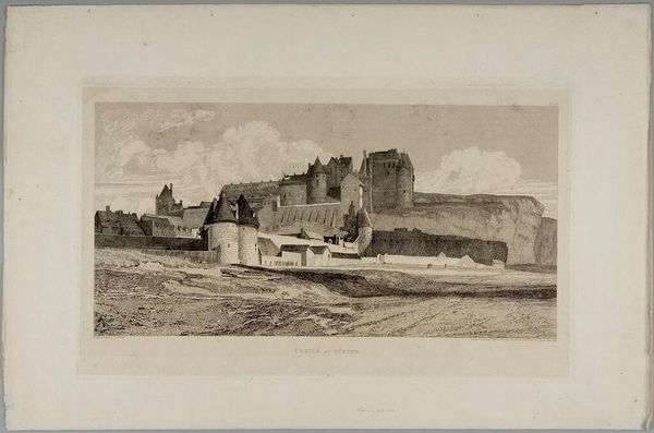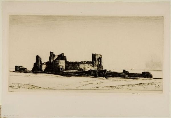Curator: Oh, it exudes this palpable feeling of enduring strength despite ruin. Almost as if it's defiantly declaring, "I am still here!" Editor: Indeed! What you're describing fits perfectly within the context of this work. What we're looking at here is "Tantallon", an etching and engraving on paper created in 1932 by David Young Cameron. Curator: Etching, you say? The texture he achieved, all those little lines...they feel like tiny scars, each one a story. It reminds me of aging skin, marked by experience and time. Is that strange? Editor: Not at all. Symbolically, ruins like Tantallon Castle often represent the transient nature of power, of human endeavor, even empires. Yet, paradoxically, their continued presence also symbolizes resilience, memory, and the enduring weight of history. Curator: Right! You know, the whole thing gives off a solitary, windswept feeling, almost as if you’re the last person standing on the edge of the world. Did Cameron have some personal connection with this specific site? It's more than just documenting stone and mortar, right? Editor: Art historians say Cameron had a particular fondness for Scottish landscapes, imbuing them with a certain romanticism, reflecting perhaps the cultural identity and ancestral ties that many Scots, himself included, felt so deeply. He does capture a spirit of place, for sure! You get the sense of elemental forces at play… Curator: Absolutely. All those fine lines make it look like the castle itself is almost breathing, adapting to the landscape and time itself. As though time is actually etched on it. Editor: A powerful interpretation. Ultimately, works like “Tantallon” encourage us to contemplate the past, to see ourselves as part of a continuing narrative, constantly shaped and reshaped by time. Curator: Mmh, it's like we’re all ruins in progress, aren't we? Learning, changing, holding on. Thanks, Cameron, for reminding me!