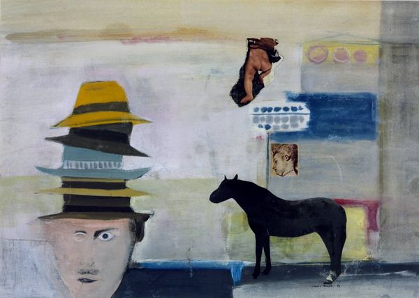 Editor: So, here we have "3. Steve Hart Dressed as a Girl" by Sidney Nolan. The figure is undeniably unsettling, especially with that wide-eyed gaze. What is your reading of this peculiar portrait? Curator: It's a fascinatingly subversive image! Nolan often played with the Ned Kelly mythos, and this pushes it further. Is it Hart's vulnerability on display, or is it a commentary on performative identity, a disguise that reveals more than it conceals? The landscape itself mirrors the character's ambiguous state – a kind of dreamscape. What do you feel when you consider that this is more than just a visual representation? Editor: It's unnerving, yet thought-provoking. I hadn't considered the performative aspect. Curator: Exactly! It's a conversation, not just an image, isn't it?