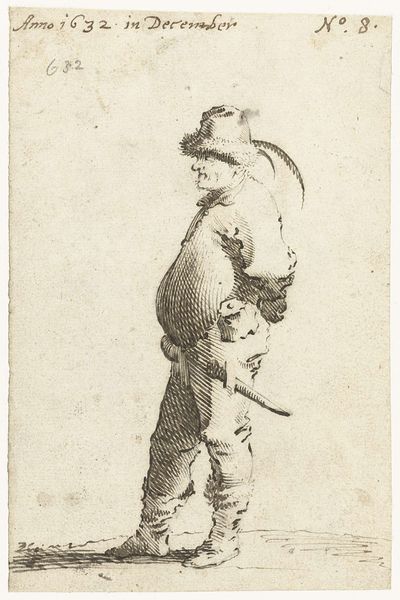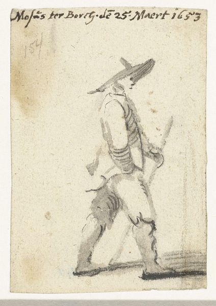 Harmen ter Borch created this drawing, 'Ruiter te paard in een landschap', with pen and brown ink around 1651. Ter Borch lived during the Dutch Golden Age, a period marked by unprecedented economic prosperity and artistic innovation in the Netherlands. In this sketch, a rider is depicted from behind, adding an element of anonymity and universality. The work subtly references the social hierarchy of the time, with equestrian portraits often associated with nobility and military prowess. However, Ter Borch was known for genre scenes focusing on domestic life, thus he develops an alternative narrative: by situating the rider in a simple landscape, he democratizes the image, inviting viewers from diverse backgrounds to identify with it. The emotional restraint and the lack of idealization in Ter Borch’s works resonate with a modern sensibility, highlighting the quiet dignity of everyday life. The work reflects a society in transition, one where traditional symbols of power were being subtly questioned and redefined.