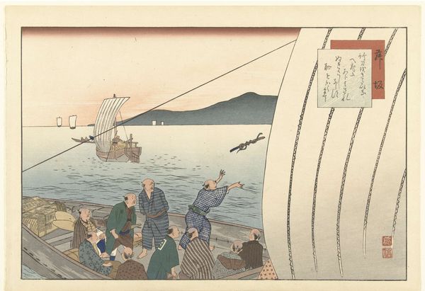 Editor: This woodblock print by Mizuno Toshikata, "Kaigun shoko to seishin no senryaku toron suru zu", features naval officers on what appears to be a warship. What do you see in the symbolism of the ship itself, both as a vessel and a weapon? Curator: Indeed. The ship, particularly as a symbol of Meiji Japan, embodies a fascination with Western technology and imperial ambition. Consider how the cannon, prominently displayed, speaks to anxieties about military power and national identity in the late 19th century. What feelings does it evoke in you? Editor: It feels like a show of force, but also maybe some insecurity? Curator: Precisely. The ship, then, becomes a stage where psychological and cultural dramas play out, reflecting a nation grappling with its place in a rapidly changing world. Editor: I didn't think about it that way. Now I'm going to read more about the Meiji era. Curator: It's fascinating to explore how a single image can contain so much historical and emotional weight.