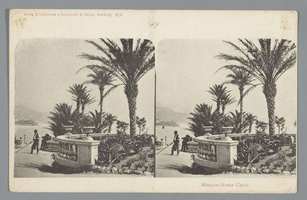 Curator: This photograph, dating from 1863 to 1891, captures the casino gardens in Monte Carlo. It is by Neurdein Frères, a photographic firm known for their cityscapes and landscapes during that era. Editor: What strikes me immediately is the image's composition: the lush, almost overwhelming density of the foliage contrasted with the geometric lines of the architecture and the implied openness of the bay. It’s a controlled explosion of plant life. Curator: Exactly. Monte Carlo, during this time, was strategically transforming itself into a leisure destination for the European elite, and this image reflects those ambitions. The garden, carefully planned, offers an illusion of paradise achieved through human intervention. It signifies the new colonial relationship with exotic places. Editor: The sepia tone, the way the light filters through the palm fronds, definitely evokes an Orientalist sentiment, fitting the time. We see how photographic technology creates depth—layers of vegetation in the midground before a blurry ocean landscape and distant mountains. Curator: You are right; Orientalism shaped artistic styles, which became desirable within the Western markets. What strikes me is how staged these photographs would have been. It served not just as documentation, but as a carefully manufactured advertisement aimed at a specific wealthy demographic. Editor: Consider the photographer's framing; our eye moves from the structured pathways into a tangle of exotic plants. The interplay of shadows and highlights animates forms. There is definitely an interplay between the manmade and natural structures. Curator: These manicured gardens became visual representations of power and wealth—an intentional projection. Think of it as an early form of destination marketing. The Neurdein brothers were contributing to constructing an idealized version of Monte Carlo for public consumption, a key element for urban and colonial propaganda. Editor: Ultimately, it is an intricate arrangement of line, form, light, and shadow that holds our eye. Regardless of its intentions, one finds oneself drawn in the rich tones. Curator: I agree; what we must appreciate is its profound role in actively promoting both place and a lifestyle that has since become ingrained in the history and culture of the Western imagination.