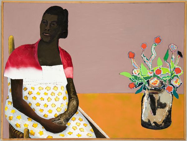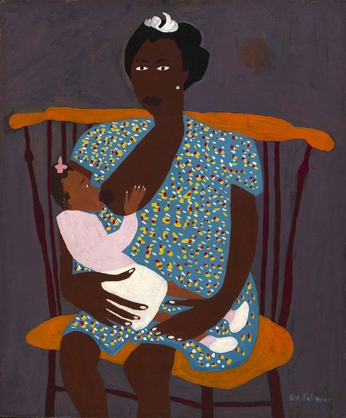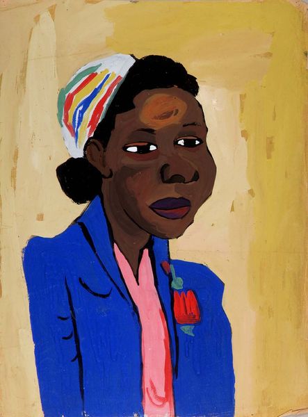 Editor: This is "Little Sweet," an oil-on-plywood painting created by William H. Johnson in 1944. I find the color choices really striking; it feels both vibrant and somewhat unsettling. What's your perspective? Curator: Well, I find myself immediately drawn to the materials and process. The oil paint, applied so deliberately onto plywood, suggests a very conscious engagement with available resources, perhaps reflecting wartime material constraints. Does that bright, almost clashing color palette remind you of folk art traditions or popular printmaking techniques of the era? It certainly makes one consider the socio-economic context in which this work was created. Editor: That's interesting! I was only focusing on the aesthetic impact. How does thinking about the materials change how we view the subject? Curator: It shifts the focus, doesn't it? The subject isn't just a portrait; it's an examination of labor, consumption, and the materiality of everyday life. Consider the flat planes of color: Do they evoke a sense of mass production, perhaps a critique or comment on the burgeoning consumer culture? Editor: I hadn’t considered that. So, the plywood isn’t just a surface; it’s part of the story? Curator: Precisely! It's integral. It connects the artwork to broader narratives about access, class, and the democratization of art through accessible materials. What if Johnson deliberately chose such base materials? Editor: This really opens up the work in a new way for me. It’s more than just a charming painting; it’s a statement. Curator: Exactly. It encourages us to think about the conditions of production and the social implications of materials, even in something seemingly as simple as a portrait.