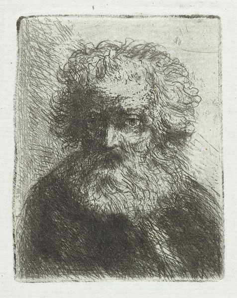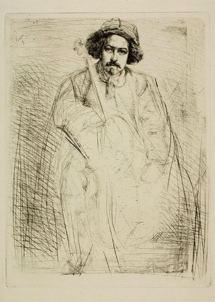 Editor: This is Marcellin Desboutin’s self-portrait, an etching from around 1895. There's something about the cross-hatching that gives it this wonderful feeling of introspection. What do you see in this piece? Curator: Well, beyond the masterful technique of the etching itself, notice the pipe. It’s not just a pipe, it’s an attribute. The pipe, particularly in portraits of artists, often symbolized leisure, contemplation, and a connection to Bohemian life. Editor: A Bohemian life? How so? Curator: Think about the cultural memory embedded in tobacco itself. For centuries, tobacco consumption—like coffee or tea—has been tied to spaces of gathering, reflection, and, significantly, social and artistic exchange. A pipe, therefore, becomes shorthand. Desboutin is not simply portraying himself, he is visually locating himself within a specific artistic lineage, echoing artists such as Courbet. What stories do you imagine it conveys? Editor: So, it's like he’s using a symbol to align himself with a particular identity or set of values. I also notice he isn't making direct eye contact. Curator: Precisely. His averted gaze invites speculation. The eyes often are windows to the soul. Here, however, he offers an obstruction and concealment of emotional revelation. The suggestion is one of private thoughts and obscured motivations. It speaks volumes about self-presentation and artistic persona. Editor: That's fascinating, it really opens up the idea of the artwork to many layers of symbolism that I didn't initially notice. It seems like every object and gesture holds some sort of hidden history! Curator: Absolutely. It invites us to unpack not just the image, but the entire cultural landscape within which Desboutin was operating. It helps us understand visual art not as a pure representation but as a dialogue with artistic predecessors.