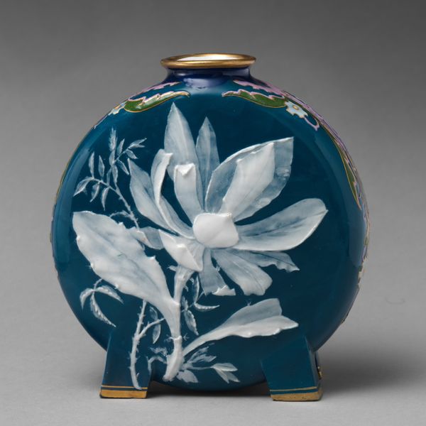 Editor: Here we have a striking glass sculpture titled "Peony", created by Thomas Webb & Sons, sometime between 1885 and 1899. The contrast between the ruby red glass and the intricate white carving gives it a jewel-like quality. It feels delicate, almost precious. What's your perspective on it? Curator: I see this piece as speaking volumes about the Arts and Crafts movement's ambition to elevate decorative arts to the level of fine art. Consider the socio-political context: the late 19th century was a time of rapid industrialization, and movements like Arts and Crafts critiqued mass-produced, often poorly designed, goods. Editor: So, something like this vase would have been making a statement? Curator: Absolutely. Its hand-carved nature and high level of craftsmanship reject the factory-made aesthetic. It evokes earlier craft traditions while reflecting contemporary artistic values. Editor: I hadn’t really thought about the labor involved. Now I see a delicate network of a spider web around the neck... Did that imagery have particular significance then? Curator: Good eye. That inclusion, alongside the Peony, transforms the piece. The peony, with roots in Asian cultures and meanings related to wealth, may represent class aspirations. What's the spider's role? It suggests not just beauty, but also artifice and labor. How are things made and for whom? These become crucial considerations when we interpret this object in its time. Editor: That’s fascinating. So, what looked like pure decoration is actually quite pointed. It makes you think about who this would have been made *for*. Curator: Precisely. That question is just as important as admiring the Peony itself. Looking closer reveals the political underpinnings of design and display.