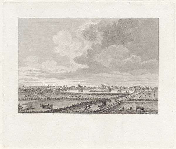 Editor: Here we have "Ruins after the Fire in Uithoorn, 1781," a print made after 1782 by Caspar Jacobsz. Philips. It's an etching and engraving showing a cityscape in ruins, a pretty somber scene. What do you see in this piece? Curator: Well, beyond the immediate depiction of destruction, I see a very deliberate act of public memory-making. Prints like these circulated widely, shaping public perception of events. Consider how the artist chose to represent this tragedy: we see not just the devastation, but also the stoicism of the figures walking through the rubble. Editor: So, you're saying it's not just a factual record? Curator: Precisely. It’s a constructed narrative. How does the artist visually communicate this "stoicism" you perceive? Are these figures distraught, panicked, or something else? The deliberate depiction implies resilience, a community facing adversity. It implicitly asks viewers to consider how *they* should respond to such events and plays a critical role in shaping historical narratives and even solidifying a communal identity around shared experiences of disaster and recovery. Editor: I see what you mean, it is as if the people were spectators just like us! Curator: Yes, almost. And how might that pose a risk of erasing other aspects? Could such representations, intended to galvanize community spirit, also overshadow the trauma, the economic devastation, or even questions of accountability related to the fire itself? What did you make of that big house in the back that looks mostly undamaged? Editor: Wow, I hadn't thought about the erasure. Maybe they want us to consider that the damage was selective. I’ll certainly view similar historical depictions more critically now. Thanks. Curator: Likewise, this highlights the active role art plays in shaping how we understand and remember the past, it has been enriching!